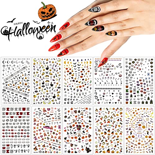 new|1200+ Patterns Halloween Nail Stickers- 3D Self Adhesive Nail Art Stickers- Nail Designs Decoration Accessories Include Pumpkin/Bat/Skull/Ghost/Witch for Halloween Party DIY Nail Decor (10 Sheets)