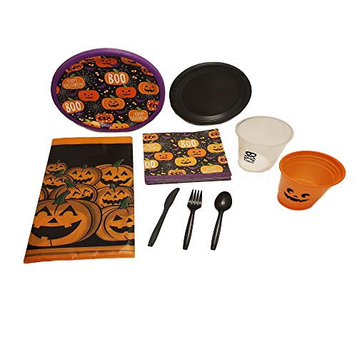 ๐HALLOWEEN THEMED SUPPLIES๐: Paper plates, cups and napkins feature a smiling Jack-O-Lantern (Pumpkin) and Toxic design; This party supplies set can be used to create a well-coordinated Halloween theme for children's birthdays, family events, trick or treating, sleepovers, catering, horror movie nights, office parties, and classroom parties