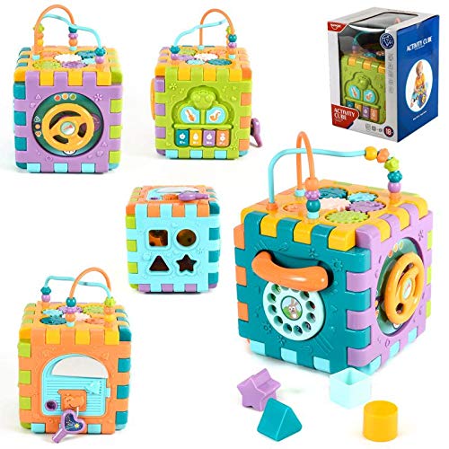 The educational learning house includes 5 pieces of geometrical shape blocks, 6 pieces of animal blocks with animal sounds, musical playing, opening door game, piano keys, counting center, flashing light help kids develop cognitive skills