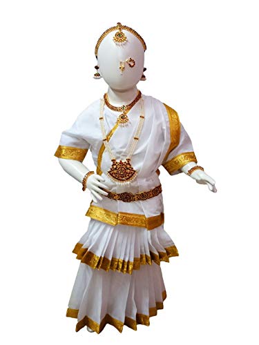 Contains Blouse, White and golden Saree, Small Fan (Starting from Back till front), Big Fan with pleats in the front, and Front cloth like an Aprin (Pallu Style) along with 10 pieces of Artificial Jewellery (includes Choker Necklace, Long Necklace, set of 2 Bangles, a pair of Earrings, Nath, Ornamental Belt, Sooryan, Chandran, Maang Tika and a pair of Armlets (baajubandh))
