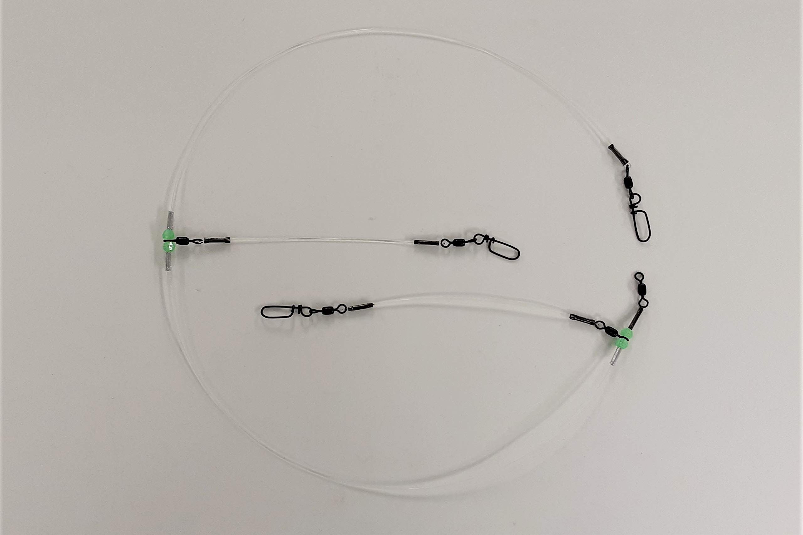 100lb Momoi Diamond Line... 100lb Rosco Coast Locks And Barrel Swivels... 30" Long... Copper Double Barrel Crimps... Glow In the Dark Beads