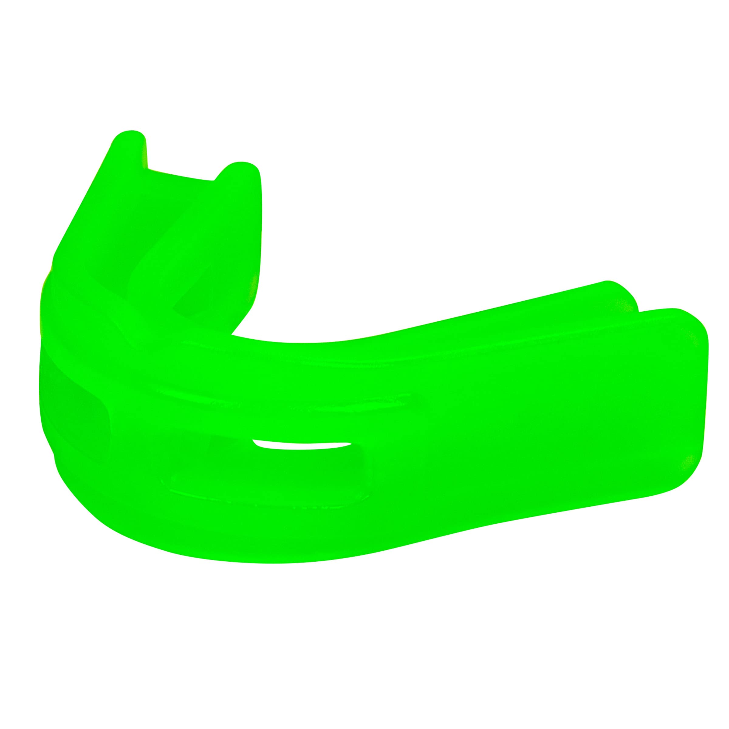 Dual tray mouthguard, protects upper and lower teeth, reduces impact forces to base of skull, large breathe hole.