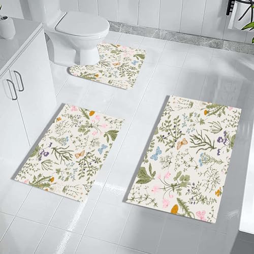 new | MUGINYU Wildflower Botanical Bathroom Mats Sets 3 Piece, Floral Flower Sage Green Leaves Bath Mat Vintage Spring Boho Plant Thin Rubber Quick Dry Rugs Eucalyptus Bathroom Decor