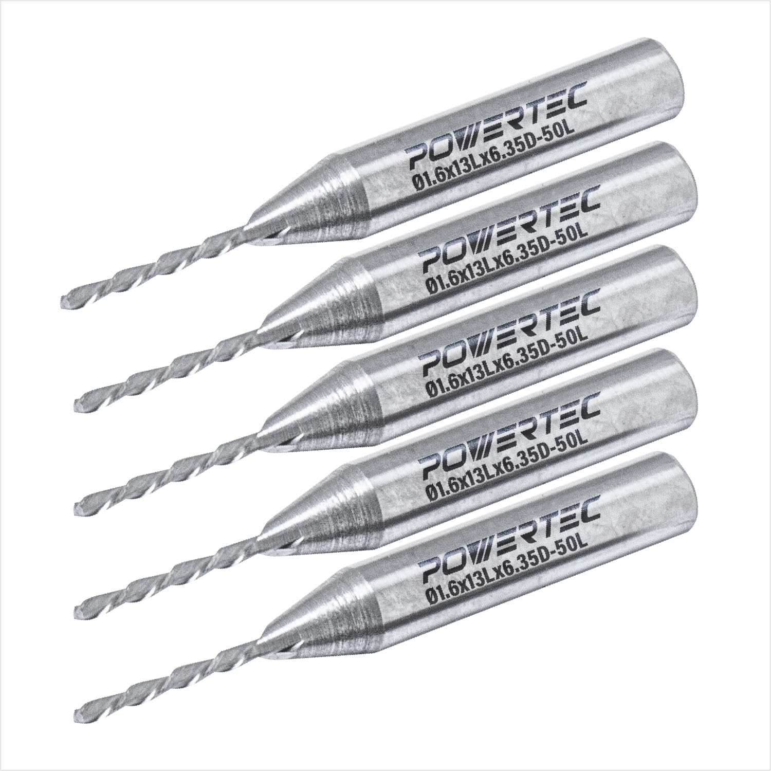 INCLUDES: (5) Downcut Spiral Router Bit with a 1/4" shank, 1/16" cutting diameter, 1/2" cutting length, and 2" total length for use with routers with a 1/4" collet
