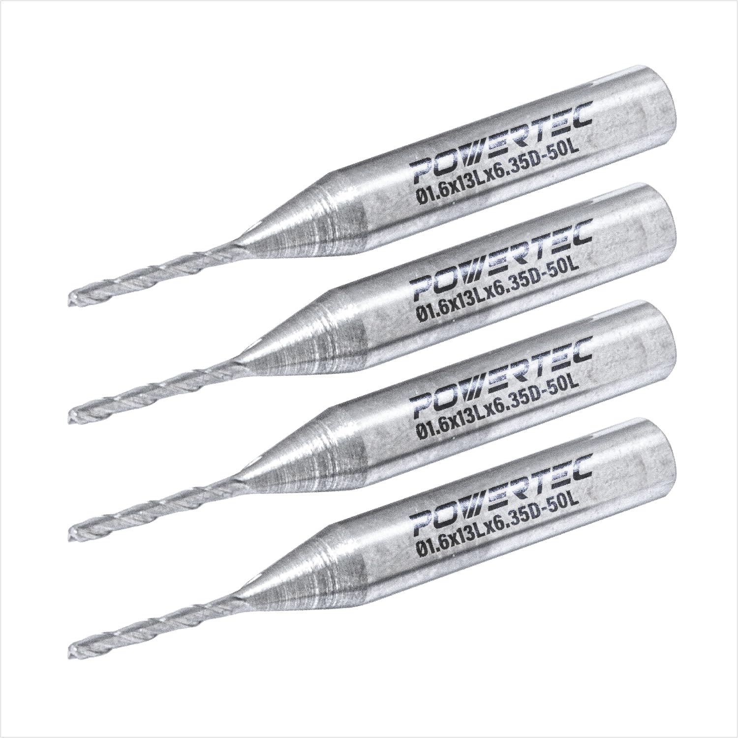 INCLUDES: (4) Spiral upcut router bit with a 1/4" shank, 1/16" cutting diameter, 1/2" cutting length, and 2" total length for use with routers with a 1/4" collet